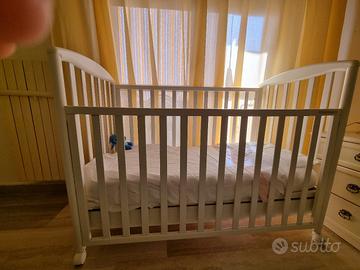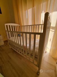 Lettino con rete in doghe di legno, spondina regolabile, 4 ruote piroettanti di cui 2 frenanti.