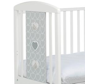 Una delle testate del lettino ha decorazioni con teneri cuori in rilievo che racchiudono un dolcissimo orsetto. Il lettino ha un ampio cassetto inferiore, suddiviso in due scomparti, e ruote gommate antigraffio, con sistema frenante, per facilitare gli spostamenti.