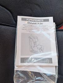 Come da titolo seggiolino gruppi 1, 2 e 3, completo di imbottitura per riduzione. Si aggancia all'auto con cintura di sicurezza. E' presente sotto alla fodera (lavata) una macchia scura (in foto).