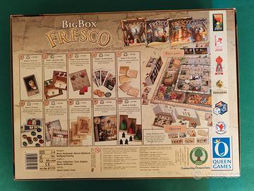 All'interno troverete una grande plancia di gioco, schermi per tutti i giocatori, schede riassuntive per i giocatori, un gran numero di segnalini in legno colorato, tasselli in cartoncino, e ovviamente il regolamento. Fresco: Big Box contiene tutto ciò che fornisce il gioco base Fresco, comprese tutte le espansioni realizzate fino alla 10.