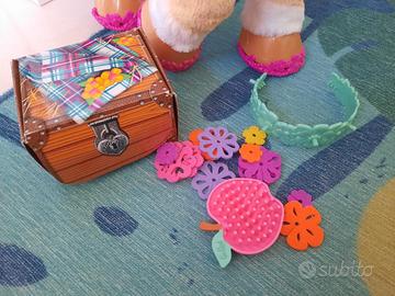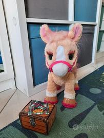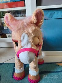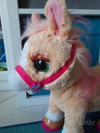 Adorabile cucciolo di Pony di circa 35 cm, con oltre 80 suoni e reazioni. Sbatte le palpebre, muove le orecchie, la testa e il collo. Emette anche dei teneri suoni. Risponde in maniera affettuosa: accarezzale il naso e le guance e lei reagirà muovendo delicatamente la testa e le guance si illumineranno. Chiuderà gli occhi, emetterà adorabili suoni e manderà dei bacini. Due opzioni di gioco, una interattiva come sopra descritta, l'altra, in modalità notturna, con suoni e melodie per accompagnare il bimbo durante il sonno. Completa il tutto la spazzola con i fiori come da foto. Prenditi cura di lei: dalle da mangiare o strigliala con lo speciale accessorio mela 2 in 1. Perfettamente funzionante e in ottime condizioni, pari a nuovo. Batterie non incluse. Zona di ritiro Arco di Travertino.