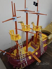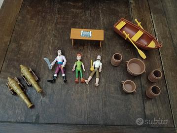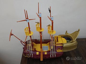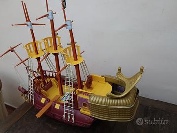 bellissimo galeone dei pirati con 3 personaggi , Capitan Uncino, Peter Pan e un pirata. Stiva scorrevole e ruote come si vede da ultima foto. in ottimo stato con i seguenti accessori, scialuppa, 2 canoni, 2 tinelle, e 3 botti. ottimo regalo. Dai 3 + anni