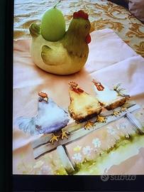 Idea regalo, federa dipinta a mano , mi sembra , fondo rosa. Gallinella in terracotta dipinta con candela a forma di uovo.