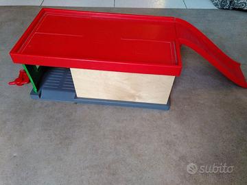 In plastica e legno, due piani per giocare in tanti modi! c'è la salita che si può anche staccare, due porte scorrevoli e la pompa della benzina!