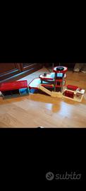 bellissimo garage in legno perfetto per giocare,include in officina e un distributore benzina.Struttura in legno robusta e colorata,3 piani di parcheggio,rampa di accesso un po' scarabocchiata a penna,il resto nuovo.. ascensore manuale