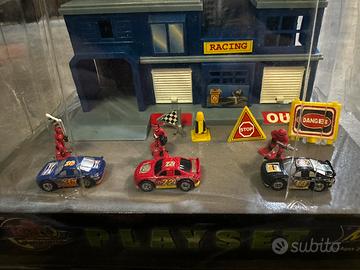 Questo è un set di gioco Micro Engines Racers, un modellino in scala di un garage con macchinine da corsa die-cast.
