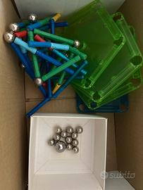 Pezzi vari. 3 basi pentagoba verdi, 1 quadrata blu. Bastoncini di doversi colori e dimensioni e varie palline. Vedi foto