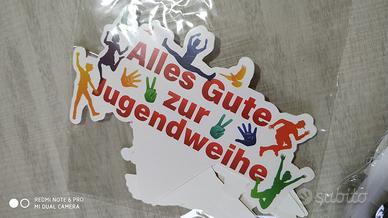 Ghirlanda da appendere con scritta in tedesco "alle gute zur Jugendweihe" nuova ancora imballata con ago e filo per montarla, completa di 20 palloncini colorati , in carta multicolore, le lettere sono alte circa 15 cm, presenti anche una decorazione grande con scritta per la torta e alcune decorazioni piccole per dolcetti