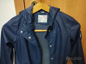 bellissima giacca a vento - impermeabile di colore blu con cappuccio e chiusura a cerniera e bottoni a pressione. due tasche sempre con bottoni a pressione. per bambini di 9-10 anni, 140 centimetri. marca Pocopiano. perfetto e senza il minimo difetto il giubbino è pari al nuovo.