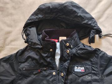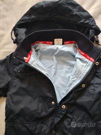sportiva ed elegante giacca a vento di colore blu scuro con cappuccio removibile. chiusura a cerniera e bottoni a pressione e 4 tasche di cui una con zip. interno color celeste. per bambini di 4-5 anni (107-113 cm). marca Prenatal. la giacca senza alcun difetto e pari al nuovo.