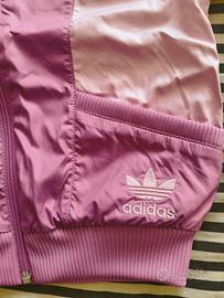 giacca a vento con la fodera in cotone . chiusura a zip.collo a colletto con due tasche di fronte al livello bacino rifiniture in materiale elastico.sulla tasca sinistra logo ricamato.taglio maniche raglan. Dal inizio spalla fino a lunghezza della manica ci stanno tre righe decorativi simbolo del marchi.Scena e maniche , anche davanti fatto con colore rosa e fucsia