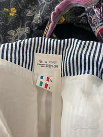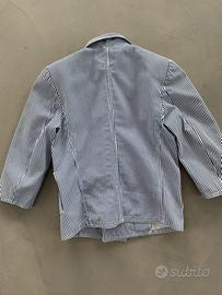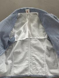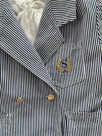 Giacca per bambino con fantasia a righe. - Tessuto in cotone. - Chiusura doppiopetto con bottoni dorati. - Tasche frontali. - Dettaglio ricamato sul taschino.