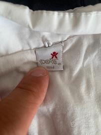 Colore bianco con stampe decorative, cappuccio, chiusura con zip e bottoni a pressione, tasche frontali.