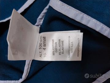 Vendo elegante giacca tipo blazer per bambino, marca Primigi. Stato: Ottime condizioni, tenuta con molta cura. Taglia: 100 cm (4 anni). Materiale: 95% Cotone, 5% Elastan (molto morbida e comoda, non rigida). Colore: Blu petrolio. Caratteristiche: Presenta una pochette decorativa sul taschino (fantasia a quadri) e curate rifiniture interne.