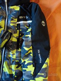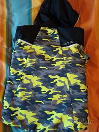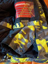 giacca da sci. mimetica, cappuccio staccabile, . coulisse sul fondo per regolare ampiezza. tre tasche, più taschino per Ski pass. tasca a rete interna.