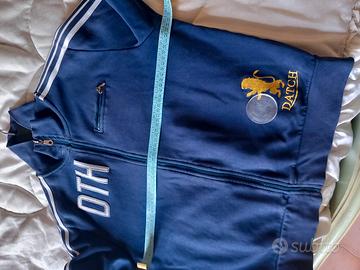 La giacca è un modello sportivo della marca italiana Datch, caratterizzato dal logo "DTH" sul petto a sinistra e dal simbolo ricamato con il nome del brand sulla parte inferiore destra. Il capo è di un intenso colore blu con strisce bianche lungo le maniche, tipico dell'abbigliamento sportivo e casual proposto dal marchio.