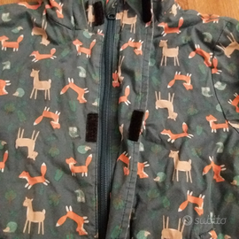 Vendo giubetto in tessuto a fantasia di animali (volpe, gufo, riccio e capriolo) su sfondo verde. In cotone resistente alla pioggia. Con cappuccio, due tasche e chiusura a zip/cerniera.