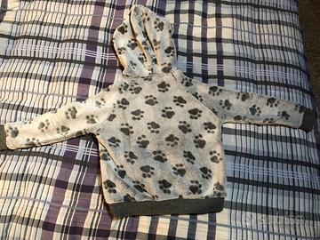 Morbida e calda giacca in pile grigia, con disegno di zampe di gatto