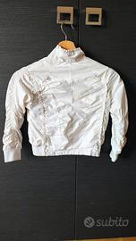 Giacca leggera da bambina Jack Morbillo, sfiancata, bianca con dettaglio ricamato argento. Taglio elegante, veste un po grande rispetto la taglia 6 anni