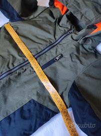 Giacca imbottita con cappuccio staccabile, chiusura cerniera, tasche, polsini in maglia. Colori: verde oliva, nero, arancione. Ottime condizioni, taglia 4 anni, misure in foto.