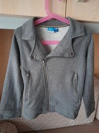Colore grigio versatile, con zip diagonale e bottoni decorativi su spalle e polsini.