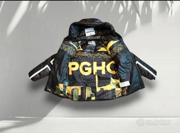 Giaccone invernale pgho di base nera con dettagli bianchi sulle maniche e caratterizzato da cerniere termosaldate e cappuccio con laccetto di regolazione. All'interno una stampa dai colori giallo fluo.
