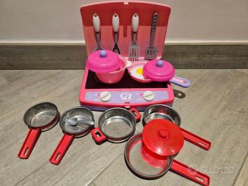Giocattoli - Carrello spesa con frutta + Cucina piano cottura con padelle e mestoli.