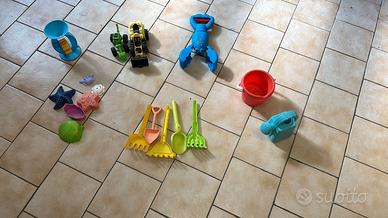 Vendo ampio assortimento di giochi da spiaggia per bambini, in ottime condizioni e usati pochissimo. Il set include tutto il necessario per giocare con la sabbia in modo creativo e divertente: tante formine colorate, palette e rastrelli, secchielli, innaffiatoi, setacci, ruspe giocattolo, uno speciale granchio con chele mobili molto bello e particolare e un bellissimo mulino da sabbia di ottima qualità.