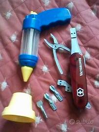 Altri giocattoli vari: a) Replica in plastica GIOCATTOLO del Coltellino Svizzero multiuso "Victorinox", con 3 inserti mobili per cacciavite. Versione superiore con accessorio PINZE e altri (sempre in materiale plastico) tra cui la TORCIA a pulsante funzionante con nuova piletta, ma mancante della lama-coltello. b) In plastica : 7 accessori GIOCO dottore "CiccioBello": 1 Stetoscopio, 1 termometro, 1 forcipe, 1 forbice, 1 martelletto, 1 abbassalingua specchietto, 1 otoscopio c) GIOCATTOLO In plastica con motorino ( 2 batt stilo AA ): Avvitatore con punta cacciavite a stella d) Specchietto trucco x BAMBOLE. In plastica, colore fucsia. misure cm 13 x 6 + cerchietto flessibile per capelli bambina, ricoperto nastro tipo raso color rosa con fiore in simil pizzo/tulle. Larghezza arco 2 cm alla volta e 1 cm agli estremi. e) SMART TOUCH Tablet Clementoni GIOCO educativo elettronico. Indicato dai 3-4 anni in su. Usato pochissimo. Presente solo la doppia scheda di gioco già inserita. Servono tre batterie mini stilo da 1,5 V ( AAA )in scomparto protetto da vite. misure: cm. 24 x 18 x 2 f) Animali giocattolo in gomma : 1 Giraffa cm 18, 1 Scrofa cm. 14 g) GIOCATTOLO "Pistola" particolare con "tromboncino"(giallo) amovibile, come da foto, in plastica bicolore e trasparente ::::::: ::::::::::::::::::::::: ogni capitolo eur 7 il blocco totale con sconto a eur 25 totali tratt. Molti altri giochi, peluche ecc. su altri miei annunci. Sconti con acquisti multipli e/o anche su altri miei annunci, per esempio: SCONTO "3 x 2" Visione e consegna gratuita in Torino, oppure spedizione.