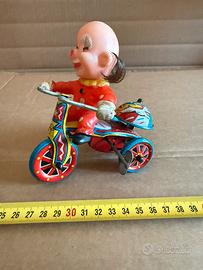 MTU Korea - Giocattoli vintage in latta a carica, legno e ferro – Clown su triciclo – MTU “Made in Korea” – anni - Giocattolo di latta a carica manuale - 1960-1969 - Corea del Sud Buone - Senza scatola originale - latta - legno - ferro Descrizione : Proposto all’asta un affascinante giocattolo vintage in latta (tin toy) a carica meccanica, raffigurante un clown su triciclo, prodotto da MTU e realizzato in Corea tra gli anni ’60 e ’70. Oggetto originale d’epoca, molto decorativo e rappresentativo della produzione asiatica di giocattoli in latta del periodo. Il meccanismo a carica è funzionante: una volta caricato, il triciclo si muove e il campanello produce il caratteristico suono, rendendo il pezzo particolarmente piacevole anche dal punto di vista dinamico oltre che da collezione Oltre all’articolo in latta il lotto comprende un bellissimo modellino di aereo completamente in legno e un modellino di moto tipo Harley in ferro. Condizioni : Buone condizioni generali, coerenti con l’età: segni di usura e patina del tempo visibili (vedi foto) lieve crepa sul telaio del triciclo, poco visibile e non influente sulla stabilità o sul funzionamento verniciatura ancora vivace e ben conservata nel complesso Si prega di osservare attentamente le immagini, parte integrante della descrizione. Dettagli Tipologia: giocattolo in latta a carica (wind-up) Soggetto: clown su triciclo Marchio: MTU Produzione: Corea Periodo: circa anni ’60–’70 Funzionamento: testato e funzionante Spedizione : Imballaggio accurato. Nota : Oggetto da collezione vintage venduto così com’è, ideale per collezionisti di giocattoli in latta o per arredamento retro