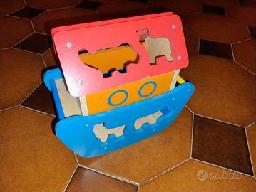 Giocattolo in legno, con figure inseribili. Stimola il bambino con gli incastri.