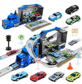 Set di gioco con camion e pista per macchinine. - Camion blu con rimorchio trasparente. - Pista con curve e accessori. - Include diverse macchinine.