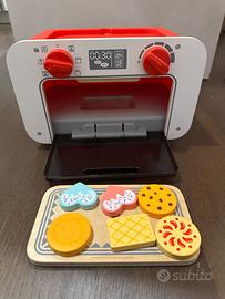 Il forno giocattolo è dotato di sportello apribile, manopole di regolazione e vassoio, più una speciale piastra per giocare con pentole e padelle.