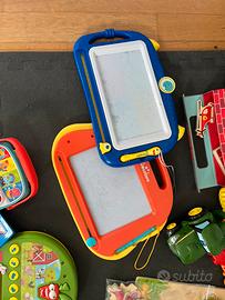 Tavolo con attrezzi, lavagne, sonagli, trenino, cantastorie, radiolina, chitarra e tutto quello che c’è in foto in condizioni ottime. Solo ritiro a mano a Milano.