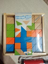Vendo in blocco set di mattoncini in legno marca BEDELUC modello Triangle Blox Nature, ancora nella confezione originale.- Set puzzle in plastica marca Tangram più pompa per palloni.-