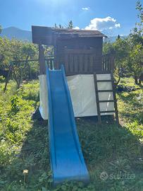 Casetta con scivolo. Scivolo con altalene. Da verniciare magari le parti in legno . Smontaggio e trasporto a carico dall'acquirente