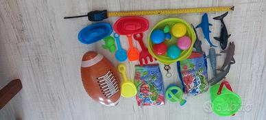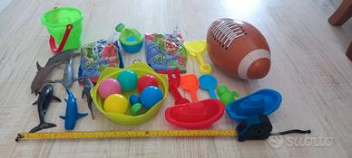 Comprende 1 secchiello, 6 pesci di gomma, 2 braccioli gonfiabili, 1 annaffiatoio, 1 portachiavi, 5 palline, 2 biglie di plastica, 2 barchette, 1 colino setaccio, 1 rastrello, 1 paletta piccola, 1 paletta media, 1 colino piccolo con manico, 1 formina a tartaruga, 1 pallone da football gonfiabile.