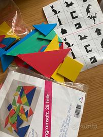 Polimini e forme geometriche per tassellazioni per imparare i numeri e la geometria. Insieme vendo 6 tangram (circa 10x10 cm) per giocare con le forme gettoni blu/rossi per giocare al cambio con decine e unita'.