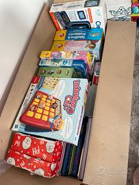 Grande assortimento di giochi ed accessori per bambini molto varia con pupazzi, giochi in scatola, libri, piccoli e grandi giochi, casco e alzatina per auto