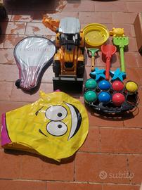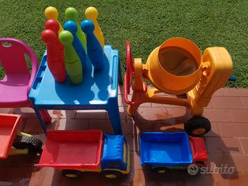 Tavolino con sedie, birilli con relativa palla, betoniera due camion grandi, cariola, taglia erba, ruspa, camion più piccoli, secchielli, palette di varie grandezze, bocce, serpente che spruzza acqua con relativa sua scatola, formine varie, e altri oggettini,piu una piscina piccola e una biciclettina senza pedali.