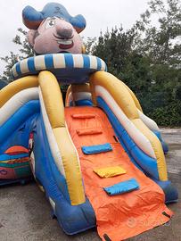 SCIVOLO GONFIABILE PIRATA STAR Il gioco gonfiabile unico nel suo genere... a forma di stella! Lungo 6,5 metri, largo 6,5 metri e alto 4,5metri. Questo incredibile scivolo ha tema piratesco, con una volto di un pirata sulla cima e quattro scivoli tutti attorno: UNO per salire e TRE per scendere. Decorato da disegni di pirati, che lo rendono molto scenografico e d'impatto. OTTIME CONDIZIONI VENDO O CAMBIO ALLA PARI CON SALTERINO o PERCORSO o COMBINATO RITIRO IN SEDE