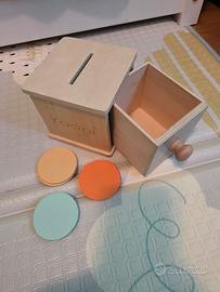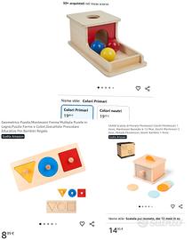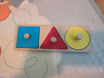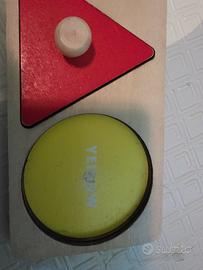 4 giochi in legno per aiutare la manualità del bambino dai 6mesi all' anno e mezzo. usati uno con un segno di utilizzo nel gioco dei puzzle sotto il triangolo giallo