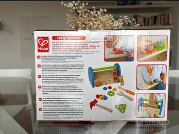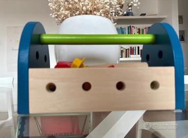 Metti a giocare il tuo piccolo con questa scatola degli attrezzi! Un ottimo modo di sviluppare le sue abilità motorie! Robusta, colorata, in legno, piena di attrezzi per la fantasia!