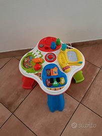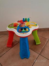 Tavolino multigioco con suoni in italiano e inglese, anelli da impilare e scatola con gioco ad incastro. Tutti marchio Chicco e Fisher Price. Condizioni ottime. Manca la pepiera e un piattino al tavolino.