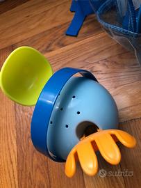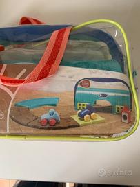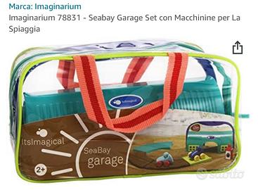 Garage con set di formine e macchinine per giocare a creare un vero garage sulla spiaggia. Con manico, capovolto funge da secchiello o cesta.