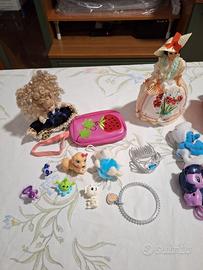 Insieme di 15 giochi da bambina, con 2 bambole, astuccio, fermacapelli, braccialetto, peluche e personaggi vari, in ottimo stato; ubicazione: San Donato Milanese (MI)