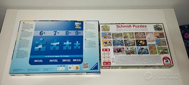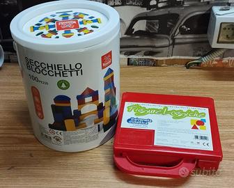 vendo giochi per bambini presenti in foto. un secchiello con 100 blocchetti in legno e una scatola di figure logiche e 2 puzzle. in buone condizioni. prezzo per tutto insieme 12 euro.