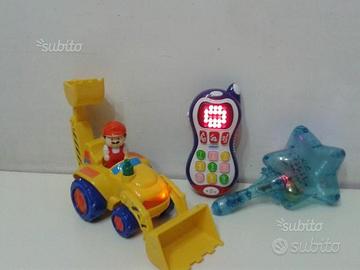 vendo in gruppo o separatamente giochi per bambini musicali in ottimo stato composto da macchina scavatrice con personaggio, telefono parlante multiattività marca del BelBebe con tre funzioni e stella carillon con luci e trombetta tasto on/off. zona Fuorigrotta