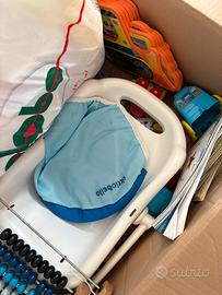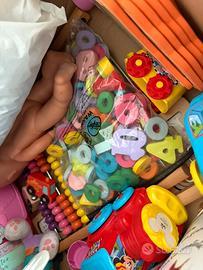 Mix di giochi per bambini da 0 a 3 anni, cavallino, macchina, giochi per la spiaggia, confiabili, libretti, tappeti morbidi con figure, giochi in legno, peluches e libretti. Alcuni in ottime condizioni e altri meno.