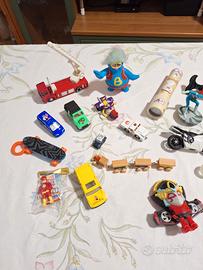 Insieme di 20 e più giochi da bambino, con 6 automobiline, mascherina, biglie, animali, trenino, caleidoscopio, pompetta per palloncini, dinosauri e personaggi vari, in ottimo stato; ubicazione: San Donato Milanese (MI)